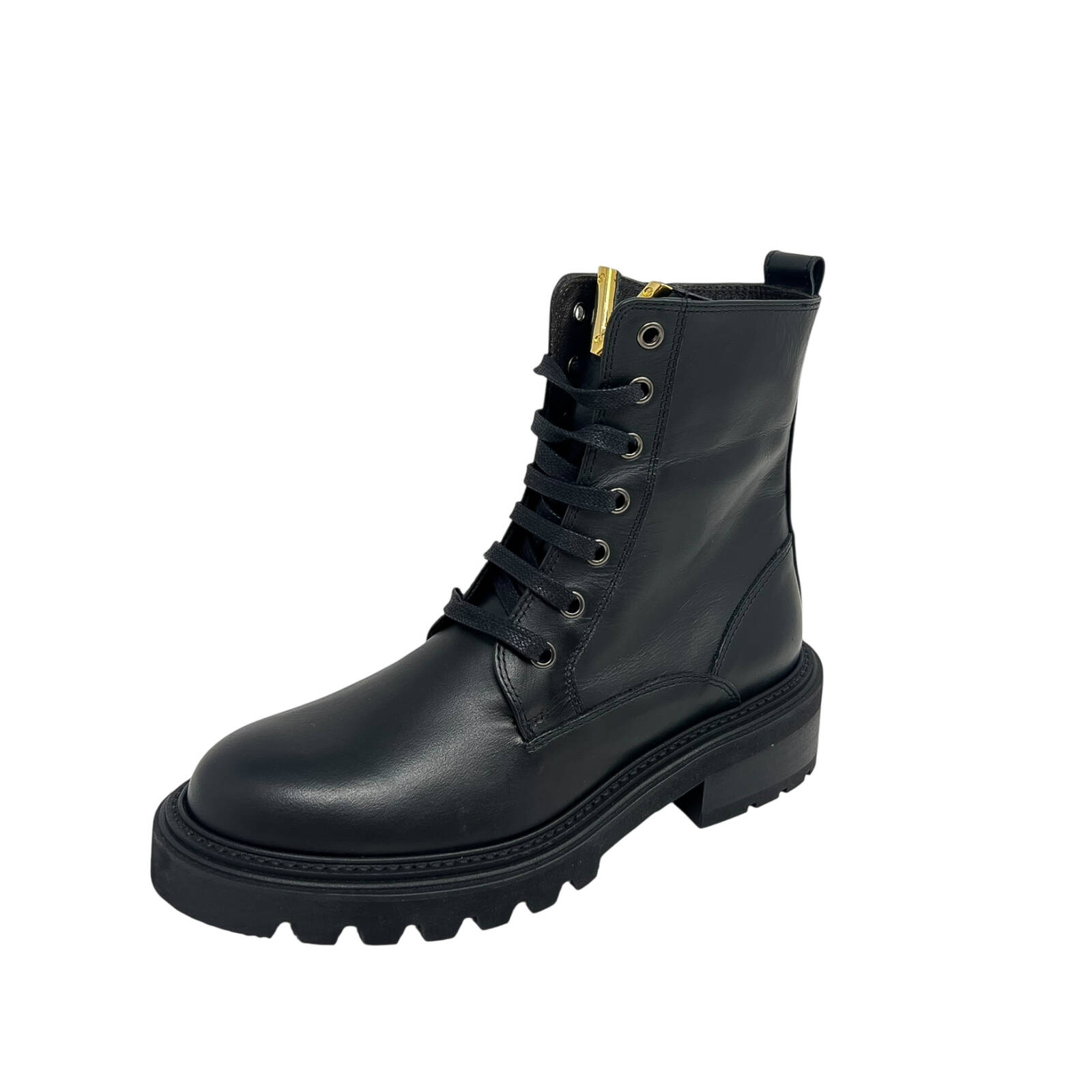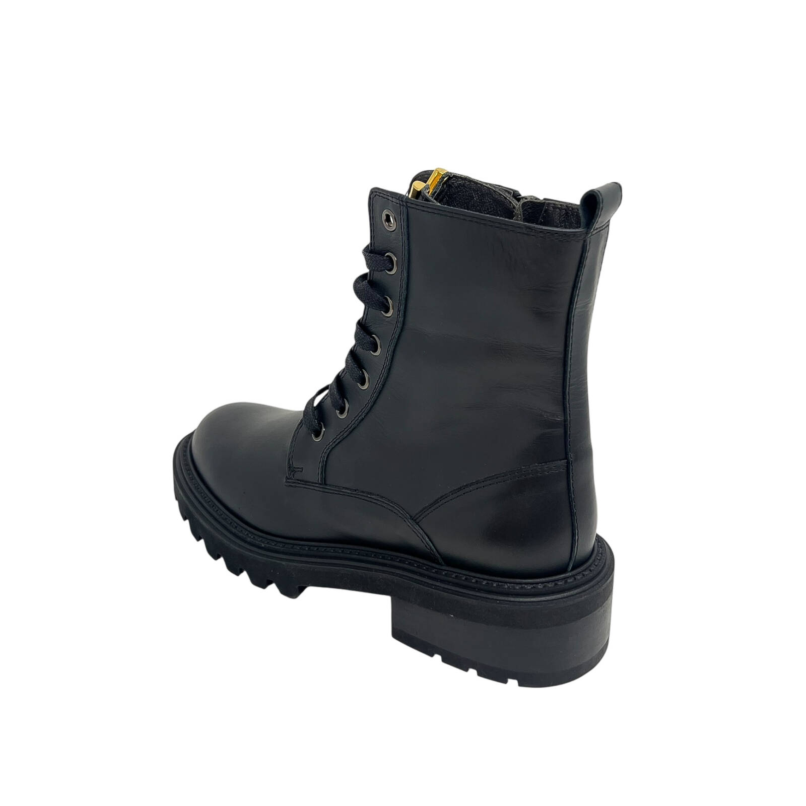 Anfibio in pelle nera con cerniera laterale e accessorio a V dorato sulla linguetta