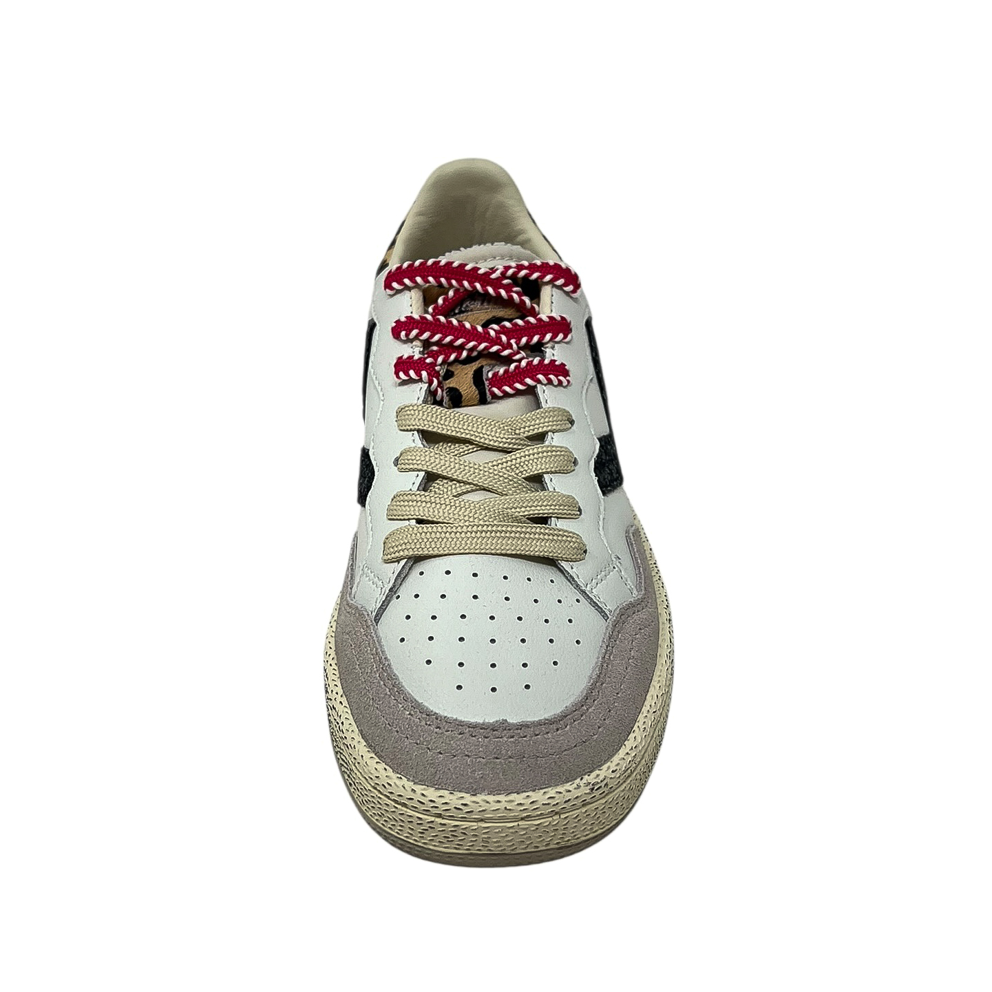 Sneaker in pelle bianca e camoscio beige con dettagli in glitter nero e maculato